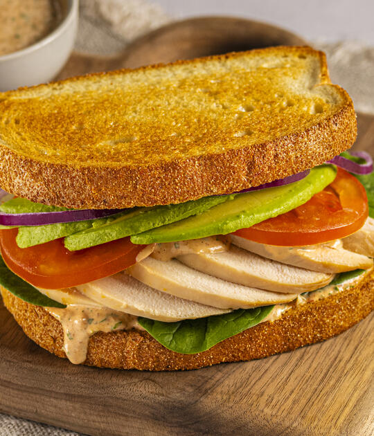 - Top with rotisserie chicken slices, more yogurt mixture, spinach, avocado, tomato and onion.