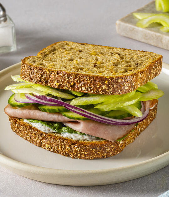 You’ll love this veggie loaded ham sandwich on Stonemill® Sourdough Sprouted Rye & 12 Grains Bread for lunch. Finished with a creamy yogurt and dill spread, it’s a healthier option that’s both tasty and satisfying
